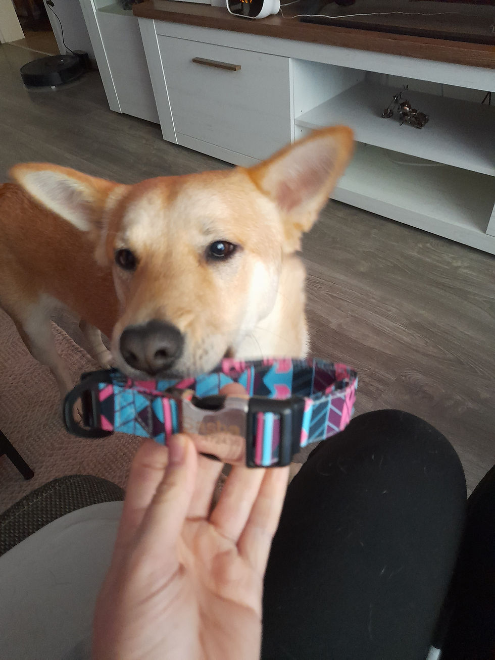 Genial, in sfarsit nu mai are medalion pe care sa il rontaie, zgarda e solida si arata foarte bine 💜 Are si destul loc sa creasca in ea 😁
