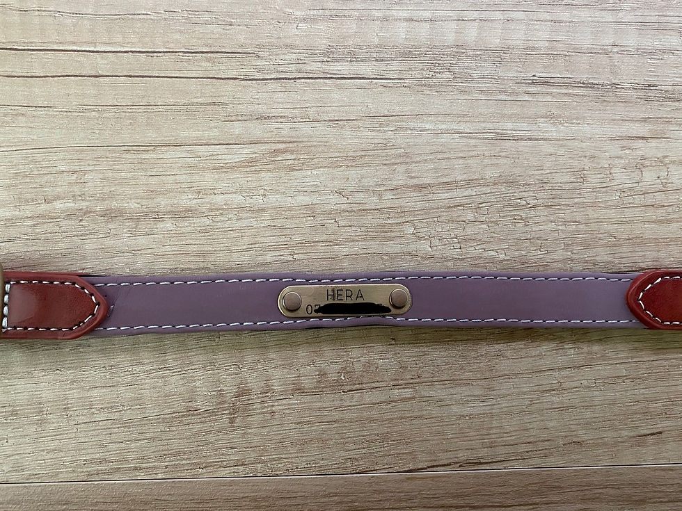 - Inel în formă de D, cusut în zgardă, pentru atașarea lesei.